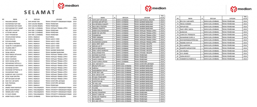 Berdasarkan proses rekrutmen yang telah dilaksanakan di SMK Negeri 3 Jombang tanggal 21 Maret 2019, maka berikut kami sampaikan Daftar nama siswa SMK Negeri 3 Jombang yang lolos tes ke tahap 2.